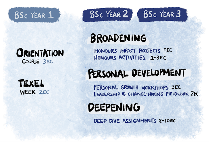 For an overview of the main elements composing the 3 year Honours Programme please refer to the image (right) and for more information on these components we have provided a breif description of on this page (below).